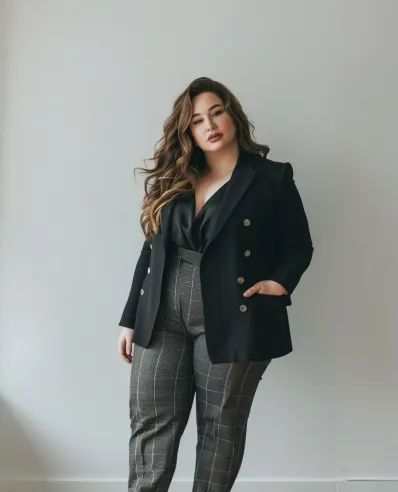 What I love about this outfit is how it instantly makes you feel powerful and put-together. The combination of a tailored blazer with those plaid trousers gives off major boss vibes, but the subtle plaid pattern keeps it fun and approachable. The black ankle boots are a great addition, giving you a little bit of height and confidence. This is one of those outfits that makes you feel like you can conquer the world while still looking totally chic and date-night ready!