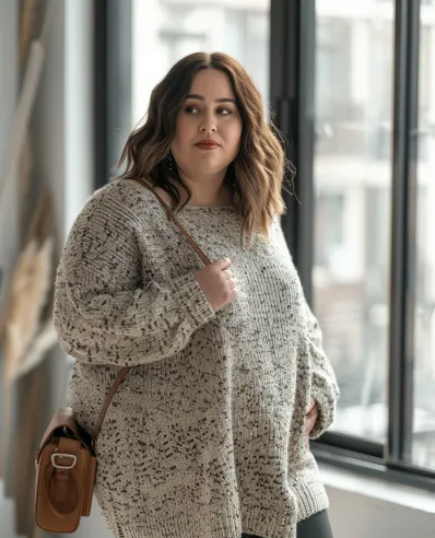 This outfit is all about cozy comfort! The oversized speckled knit sweater is perfect for those chilly first dates where you want to stay warm and look effortlessly cute. Paired with simple black leggings, this look is both relaxed and flattering, letting the sweater be the main attraction. The knee-high brown boots add a bit of structure and style, giving the outfit a polished finish. The crossbody bag adds a casual touch, making this look ideal for a low-key coffee date or a stroll through the park.