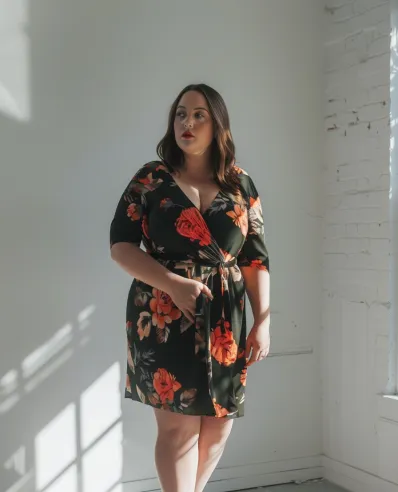 This bold floral wrap dress is a stunning choice for a first date! The deep green background perfectly complements the vibrant red and orange floral pattern, making it eye-catching without being too loud. The wrap style hugs the body in all the right places, accentuating curves while still feeling comfortable and breathable. The mid-length sleeves and knee-length hem make it a great option for any season. Paired with sleek brown ankle boots, this outfit is perfect for a dinner date or any occasion where you want to feel dressed up yet relaxed.