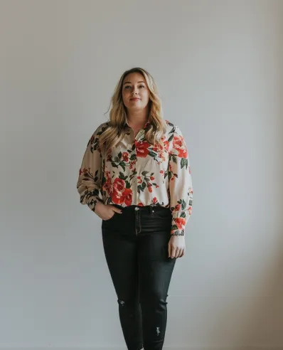 This outfit combines a soft, romantic floral blouse with dark skinny jeans for an easy-going yet stylish look. The blouse, with its light cream base and bold red and green floral pattern, feels feminine and flowy, while the dark skinny jeans offer a flattering contrast, creating a balanced silhouette. Paired with brown ankle boots, the look is casual yet polished, perfect for a day out or a relaxed dinner.