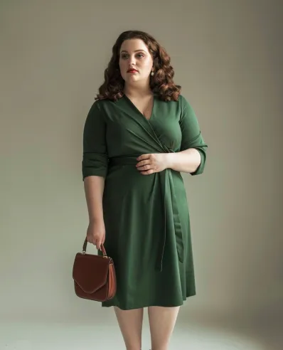 This outfit exudes classic elegance with a beautifully fitted green wrap dress. The wrap style cinches at the waist, creating a flattering silhouette that highlights curves in the most effortless way. The knee-length cut and 3/4 sleeves make it a versatile option, perfect for year-round wear. Paired with deep brown heels and a matching structured handbag, the look is polished and refined, making it ideal for a dinner date or a more formal outing.