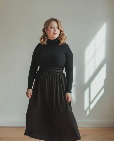 This outfit is all about understated elegance. The fitted black turtleneck creates a sleek, flattering top half, while the flowing black midi skirt adds movement and grace to the look. The pairing of a cinched waist with the soft, flowing fabric of the skirt strikes the perfect balance between structure and ease. Finished off with brown ankle boots, this look is versatile and comfortable, perfect for a daytime coffee date or even a casual dinner.