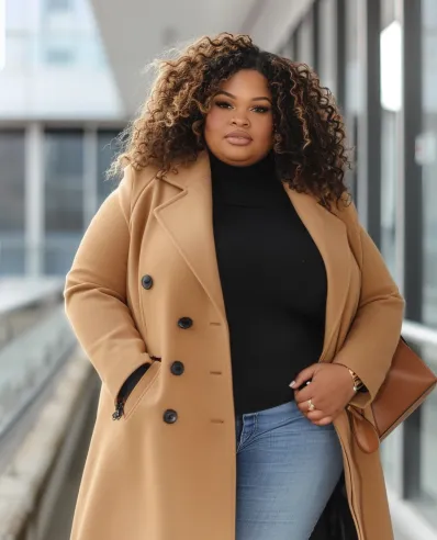 This chic camel coat paired with a sleek black turtleneck is a timeless combination that s both classic and cozy. The long coat instantly elevates the outfit, adding a layer of sophistication. Underneath, the black turtleneck provides a streamlined silhouette, while the light-wash jeans keep the look casual and comfortable. Knee-high black boots tie it all together, giving the outfit just the right amount of edge. With a small brown handbag as the perfect accessory, this look is ready for anything from a city walk to a casual coffee date.