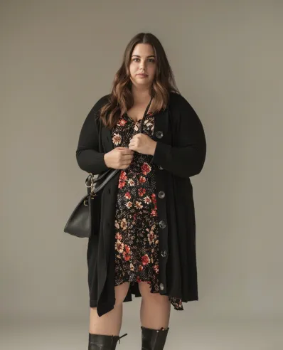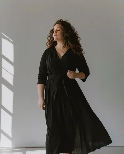 This outfit features a chic black wrap dress that effortlessly drapes over curves, creating a beautiful silhouette. The wrap style cinches the waist, emphasizing shape while maintaining a comfortable, breathable feel. The long sleeves and flowy fabric give it an effortlessly elegant vibe, perfect for cooler weather. Paired with stylish ankle boots, this look brings just the right amount of casual edge to balance the overall sophistication.