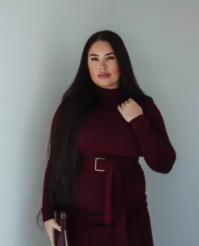 This look features a stunning fitted burgundy knit dress that hugs the body in all the right places while offering warmth and comfort. The belted waist adds extra definition, making it both flattering and chic. Paired with sleek over-the-knee boots in a matching deep burgundy shade, the look is cohesive and elevated. The rich color palette is perfect for fall or winter, creating an outfit that feels luxurious and refined without being over-the-top.