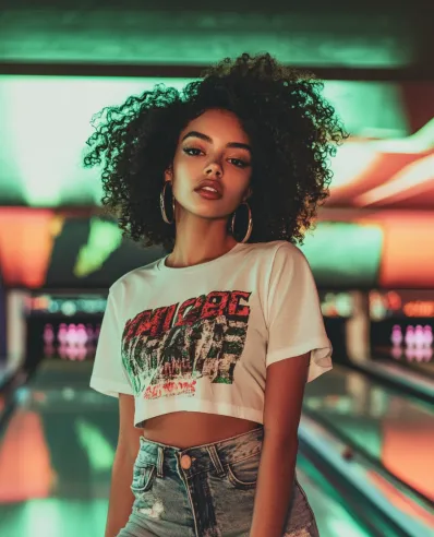 I m absolutely loving how this outfit mixes casual with a bit of edge! The graphic crop tee brings so much personality, and the ripped jeans are just the right amount of rebellious. It s one of those outfits that makes you feel confident and carefree, which is exactly what you need for a fun, playful bowling night. Plus, it’s got that effortlessly cool factor that says you’re ready for both the game and whatever fun happens after!