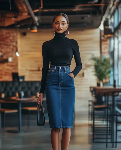Sleek and Sophisticated with a Turtleneck and Denim Skirt