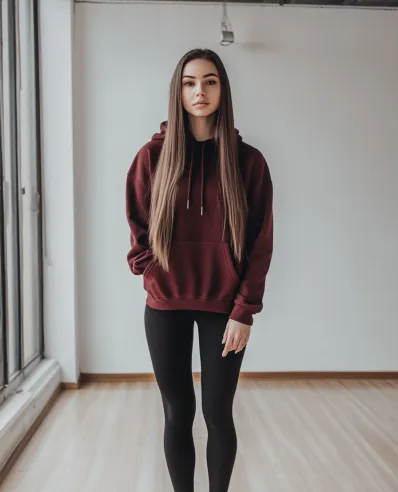 For those days when you just want to feel cozy and cute, this burgundy oversized hoodie and black leggings combo is the perfect go-to. The hoodie gives off major laid-back vibes, while the fitted leggings keep the outfit from feeling too slouchy. Finished off with classic white sneakers, this look is ideal for a casual bowling date where comfort is key.
