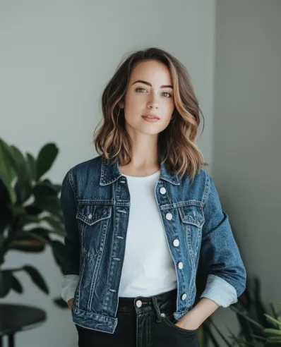 This outfit screams casual chic, with a timeless denim jacket paired over a classic white tee and black high-waisted jeans. The rolled-up sleeves on the jacket add a relaxed touch, while the jeans are fitted just right to give a flattering silhouette. It’s that perfect balance between laid-back and stylish, making it ideal for a casual outing like a fun bowling date.