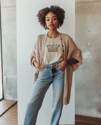 This outfit is all about effortless comfort with a touch of personality. The graphic tee adds a fun, relaxed vibe, while the oversized beige cardigan gives it that perfect cozy layer. Paired with high-waisted, light-wash jeans and brown sneakers, this look is laid-back yet stylish ideal for a bowling date when you want to stay comfortable but still look put-together.