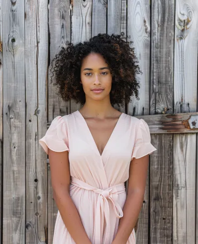 This blush pink wrap dress is a timeless blend of elegance and comfort! The V-neckline and adjustable tie waist offer a flattering fit for any body shape, while the flutter sleeves add a soft, feminine touch. The flowing fabric moves effortlessly, making it a perfect choice for spring festivities. Simple yet sophisticated, it’s beautifully styled with minimal accessories to let the dress shine.