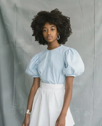 This outfit is all about sophisticated charm! A pale blue puff-sleeve blouse takes center stage, giving off a playful yet polished vibe. The structured, crisp white skirt adds contrast with a gentle flare that enhances movement. Minimal accessories like silver hoop earrings and a sleek bracelet keep the look clean and chic. This combo offers a blend of grace and fun that’s just right for Easter festivities.