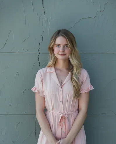 This soft pink button-up dress is both cute and comfortable, making it perfect for a casual Easter day. It features delicate ruffle accents on the sleeves and hem, with a cinched waist tie to give a flattering shape. The subtle collar and front buttons add a touch of structure, while the pastel color enhances the spring vibe. Paired with minimal jewelry, the look is simple yet charming.