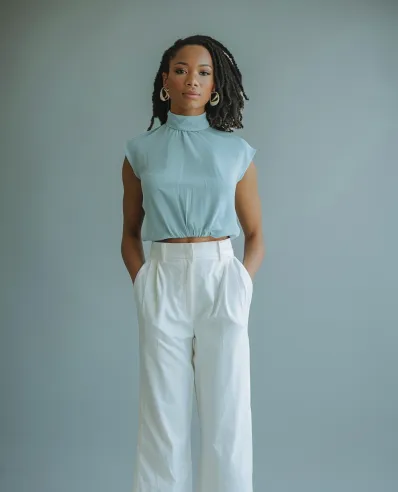 This look is effortlessly chic! The soft blue sleeveless high-neck top is elegant without being too formal, and it pairs beautifully with white, high-waisted wide-leg trousers. The combination of tailored lines and flowing fabric creates a sophisticated silhouette. White sandals and gold hoop earrings complete the ensemble, adding just the right amount of sparkle.
