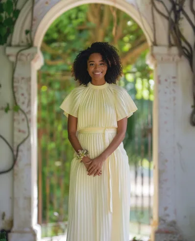 This dress is absolutely perfect for a garden party or Easter service! The pleats give it that dreamy, ethereal movement, and the soft yellow color is like sunshine on fabric. I love how it s formal enough to make you feel dressed up, yet light and breezy for outdoor gatherings. It s one of those dresses that will have you glowing in every photo!