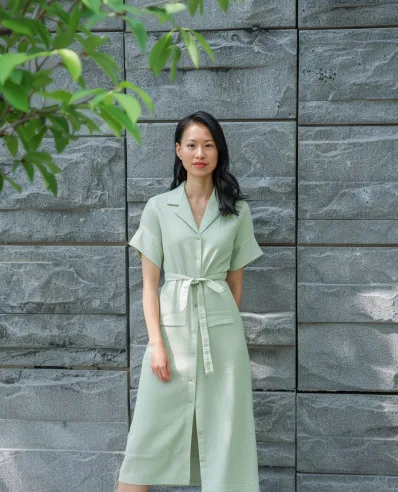 This sage green shirt dress is effortlessly chic and perfect for Easter! With a collared neckline and button-up front, it offers a structured yet relaxed look. The tie belt cinches the waist for a flattering silhouette, while the midi length provides a modest but stylish touch. Paired with white strappy sandals, it’s a versatile and comfortable outfit for springtime festivities.