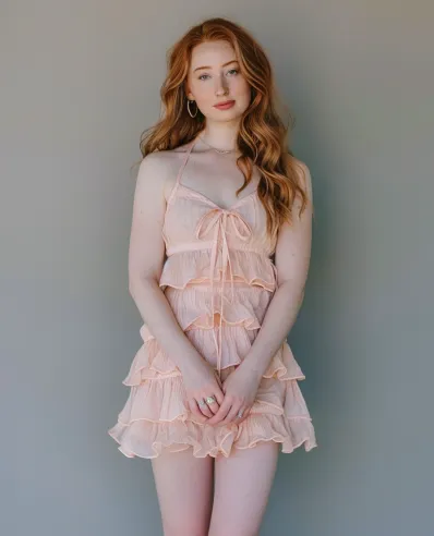 This peach-toned mini dress is giving all the springtime sweetness! Featuring flirty tiered ruffles and a halter tie detail, it s lightweight and playful, perfect for warmer Easter celebrations. The soft, flowing fabric catches the light beautifully, and the relaxed fit ensures comfort while still looking chic. Subtle accessories, like hoop earrings and a statement ring, keep things balanced and elegant.