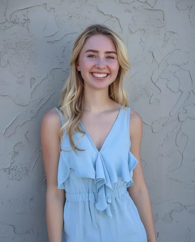 This light blue romper is a playful yet chic choice for Easter! The deep V-neckline is accented by soft, cascading ruffles that add movement and charm. The cinched waist provides a flattering fit, while the shorts keep things fun and casual. It’s styled perfectly for the season with minimal jewelry and a relaxed, cheerful vibe.