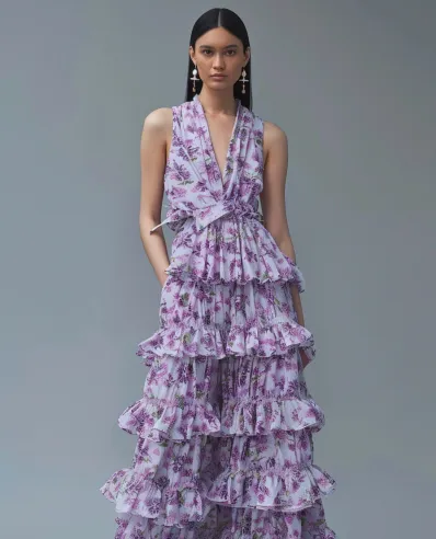 This stunning maxi dress brings the perfect blend of elegance and whimsy! With a deep V-neckline and a waist tie accentuating the silhouette, the dress flows into layers of cascading ruffles. The lavender floral print is soft and feminine, ideal for celebrating spring. Paired with minimal sandals and delicate statement earrings, the entire outfit feels luxurious yet relaxed.