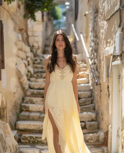 I m absolutely enchanted by how dreamy this dress is! The soft yellow color captures the warmth of spring sunshine, and the lace details make it feel extra special. It s perfect for a more relaxed Easter event imagine wearing this while exploring charming streets or enjoying a garden party. This is definitely a head-turning outfit that s effortlessly graceful!