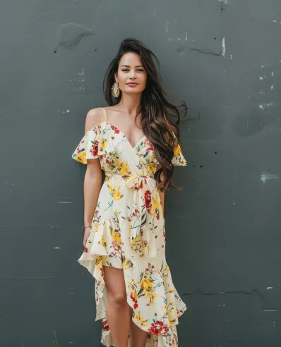 This dress is the definition of spring elegance! Featuring a high-low hemline, it flows beautifully with every step. The vibrant floral pattern on a soft yellow background brightens the look, while the off-shoulder ruffled sleeves add a romantic flair. Strappy nude heels and bold statement earrings complete this stunning ensemble, making it perfect for Easter celebrations.