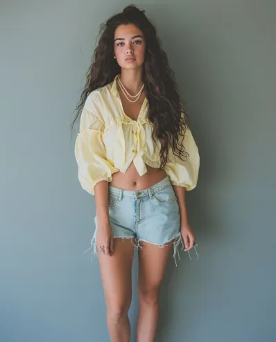 This laid-back yet playful outfit is a perfect choice for a casual Easter day! The pale yellow crop top features puffed sleeves and a knotted front, striking a balance between feminine and fun. Paired with light-wash, distressed denim shorts, the look feels easygoing and ready for outdoor activities. White sneakers and layered pearl necklaces bring subtle charm and comfort to the ensemble.