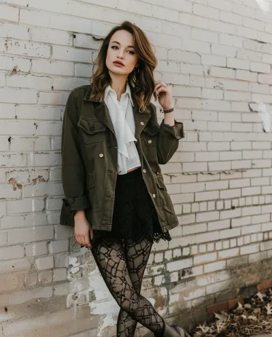 This outfit is the perfect mix of rugged and romantic. The olive green utility jacket gives off that effortlessly cool, borrowed-from-the-boys vibe, while the ruffled white blouse underneath adds a soft, feminine touch. Pair it with a black lace mini skirt for texture and movement, and then let those bold lace tights steal the show with their statement pattern. Chunky black boots bring the whole look together, giving it a grounded, edgy finish that s perfect for a day of city strolling or coffee shop hopping.