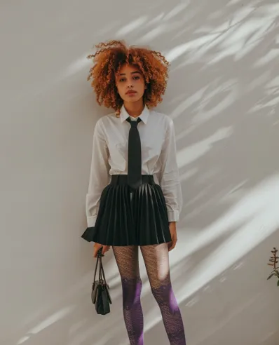 What I love most about this outfit is how it breaks the rules in the best way. It s preppy but rebellious, polished but playful basically the outfit equivalent of saying, Yes, I m cute, but don t mess with me.â The purple lace tights are such a vibe; they add personality and confidence to an otherwise monochrome look. Whether you re heading to a creative hangout or just want to feel like the coolest version of yourself, this outfit delivers.