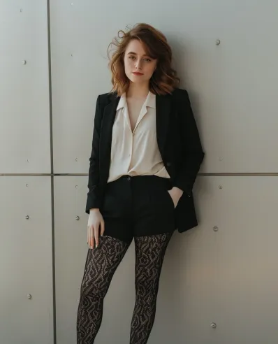 This outfit is the definition of modern sophistication with a daring twist. A tailored black blazer paired with matching high-waisted shorts creates a sleek, minimal silhouette that feels equal parts polished and playful. The cream blouse tucked underneath adds a soft contrast, keeping the look light and chic. And those lace tights? They bring all the drama and edge, taking this outfit from just another suitâ to all eyes on me.â Finished off with sleek black pointed-toe booties, the whole vibe is powerful yet effortlessly cool.