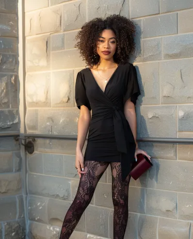 This outfit is serving full-on evening elegance with a modern edge. The black wrap dress, with its deep V-neck and tied waist, creates a stunningly flattering silhouette that works for any occasion. Paired with rich burgundy lace tights, the look goes from classic to captivating in an instant. Black pointed-toe heels elongate the legs, while the small burgundy clutch adds a perfect pop of color to complement the tights.