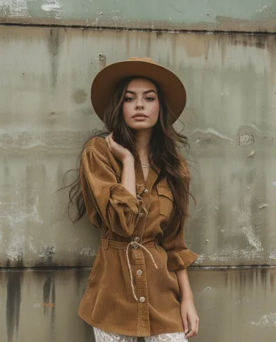 What I adore about this look is its balance of rugged and delicate. The corduroy shirt feels laid-back and cool, like you just stepped out of a countryside photoshoot, while the white lace tights add that sweet, feminine contrast. It s perfect for a fall day spent sipping coffee outdoors or wandering through a farmers market. Plus, the monochromatic earth tones are so cozy and timeless this is boho done right. If you re after something relaxed yet head-turning, this is definitely your outfit.