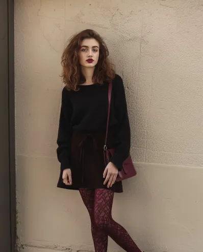 What I love about this outfit is how it makes such a statement with minimal effort. The lace tights add just enough drama to take this look from simple to stunning, while the burgundy tones give it that cozy fall feel. It s one of those outfits you can throw on for a date, a dinner, or even just a stroll through the city people will notice, but you won t feel like you re trying too hard. Plus, the contrast of the soft sweater with the textured tights? Chef s kiss.