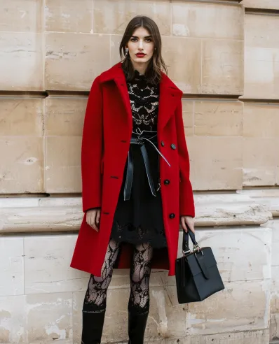 This outfit is pure sophistication with a punch of drama. The striking red wool coat is a showstopper on its own, adding warmth and confidence to the look. Underneath, a delicate black lace top pairs perfectly with a high-waisted black skirt, while the lace tights bring texture and cohesion to the outfit. Sleek black knee-high boots add a polished, slightly edgy vibe, and the structured black handbag finishes the ensemble with a touch of power dressing.
