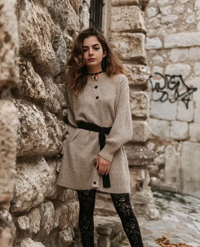 What I love about this outfit is its relaxed elegance it s like your favorite chunky sweater grew up and became runway-ready. The lace tights bring in a feminine, textured detail that makes the look feel intentional and stylish, while the black belt adds just the right shape. It s an outfit that screams I m effortlessly cool, but also really warm and comfy.â I d wear this on a crisp fall afternoon, snapping pics by old architecture while holding a pumpkin spice latte because honestly, isn t that the vibe?