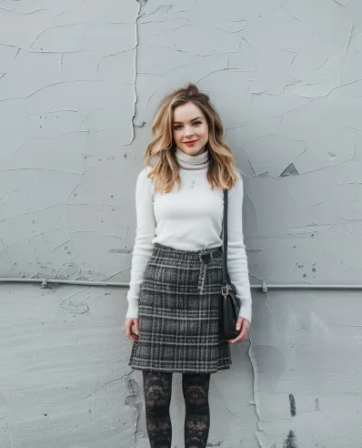This outfit is a timeless nod to preppy style with a little modern flair. A crisp white turtleneck keeps things clean and polished, tucked into a high-waisted plaid skirt that adds structure and texture. The skirt s subtle buckle detail gives it a bit of edge, while the black floral lace tights add a playful, feminine touch. Finished off with black ankle boots and a sleek crossbody bag, this look is equal parts cozy, classic, and chic.