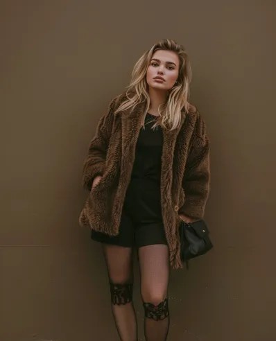 This outfit is the definition of cool-girl chic with a cozy twist. The rich brown faux fur coat takes center stage, offering texture, warmth, and that I woke up fabulousâ vibe. Underneath, a sleek black tee and tailored black shorts keep the look minimal and modern. The lace-patterned tights are the true star of the show, with delicate floral details at the thigh that add a flirty, unexpected twist. Black ankle boots and a small, slouchy bag finish things off, giving the look effortless attitude.