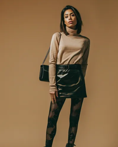 I m in love with how this outfit manages to feel so simple yet statement-making. It s like the fashion version of a mic drop you don t need loud colors or crazy patterns to make an impact. The lace tights bring just the right touch of romance to offset the edginess of the leather skirt. Plus, this look works anywhere: date night, a dinner with friends, or even a fancy-casual event where you want to look put together but not overdone. Honestly, this is one of those outfits that ll make you feel unstoppable with zero effort. Win-win!