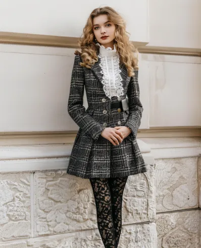 This outfit is straight out of a modern-day fairytale. The tailored plaid dress coat gives an elegant, vintage-inspired silhouette, cinching at the waist before flaring into a charming A-line skirt. The standout white lace blouse underneath adds a dreamy, romantic vibe with its high ruffled neckline and delicate details. Paired with stunning floral lace tights, this look mixes structure with softness beautifully. Black leather ankle boots round out the outfit, keeping it grounded and effortlessly stylish.