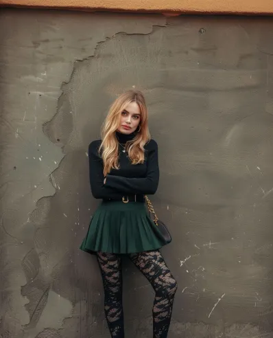What I absolutely love about this outfit is the mix of sweet and strong it s got personality. The pleated skirt makes it playful, but the lace tights and boots remind everyone you re not afraid to mix things up. It s ideal for a fall day when you want to feel stylish but still comfortable enough to stomp through the city (or snap the perfect Instagram shot). Plus, that forest green is so refreshing against the black classic but far from boring. Obsessed.