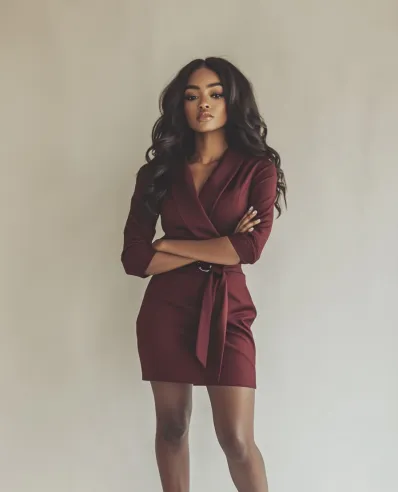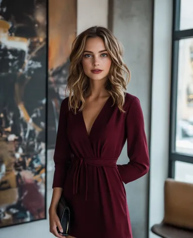 This stunning burgundy wrap dress is all about confidence and power. With its deep V-neckline and waist-cinching tie, it hugs the body in all the right places, creating a sleek and flattering silhouette. The knee-high black boots add an extra layer of boldness, making this look perfect for a night out or any occasion where you want to make a statement. The deep burgundy color and fitted style exude elegance while still keeping it sexy and modern.