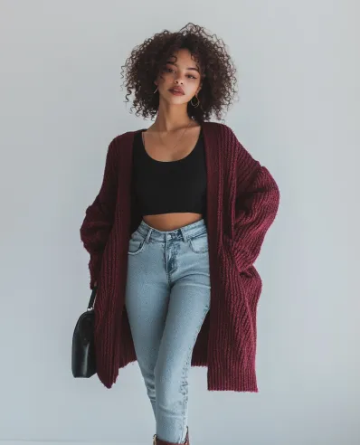 This look is all about cozy vibes with a chic twist. The oversized burgundy knit cardigan wraps you up in comfort while still looking effortlessly cool. Paired with light-wash high-waisted jeans and a simple black crop top, the outfit strikes a perfect balance between laid-back and stylish. The chunky burgundy boots pull the whole look together, adding just the right amount of edge to the otherwise relaxed feel. This is the kind of outfit that s perfect for running errands or grabbing coffee with friends but still looks totally Instagram-ready.