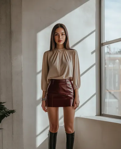 This look blends soft elegance with bold edge. The beige blouse, with its flowing puffed sleeves and high neckline, brings a touch of refinement, while the burgundy leather mini skirt adds a striking, modern twist. The fitted, high-waisted skirt contrasts beautifully against the loose fit of the top, making the outfit both polished and playful. Black knee-high leather boots complete the ensemble, pulling it all together with a sleek, confident vibe. It’s a perfect look for the woman who wants to look effortlessly chic and on-trend.