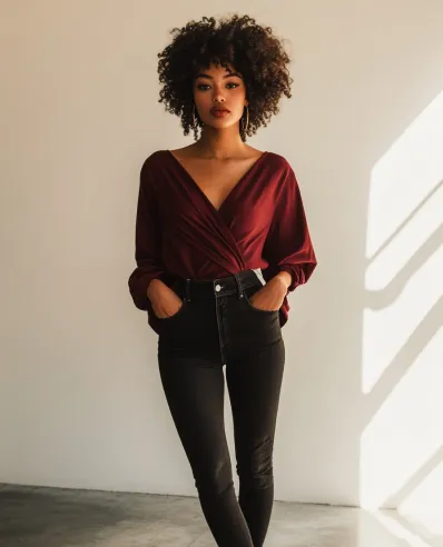Effortless Elegance: Burgundy Wrap Top with High-Waisted Black Jeans