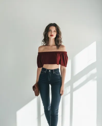 This outfit is perfect for those laid-back days when you still want to look effortlessly cute. The burgundy off-shoulder crop top adds a flirty, feminine touch with its puffed sleeves and cropped length. Paired with dark high-waisted skinny jeans, the look is both casual and stylish. The ankle boots and simple clutch give it a polished finish, making it a great option for a day out with friends or a casual dinner date.