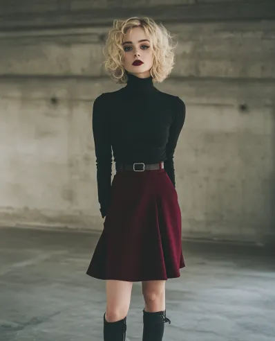 This outfit brings a classic, vintage vibe with a modern twist. The sleek black turtleneck is perfectly fitted, providing a polished base for the look, while the burgundy skater skirt adds movement and a pop of rich color. Cinched at the waist with a bold belt, the outfit creates a flattering silhouette that s both feminine and sharp. Paired with knee-high boots, this look is equal parts edgy and elegant, ideal for anything from a coffee date to a casual afternoon stroll.