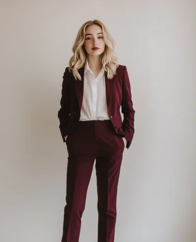 Honestly, who doesn t love a good power suit? I m obsessed with how this burgundy shade adds a bit of personality while still keeping things totally professional. It s bold but not too loud the perfect middle ground. And paired with the classic white shirt? It s like a masterclass in effortless boss-lady style! I could totally see myself rocking this in any high-stakes situation, knowing I look sharp and feel unstoppable.