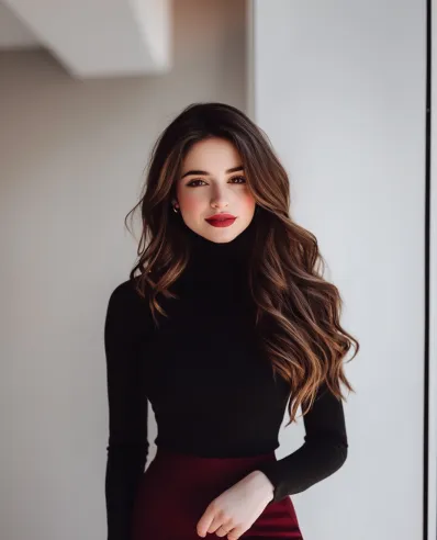 This outfit is pure sophistication with a touch of boldness. The fitted black turtleneck creates a sleek and classic top half, while the deep burgundy pencil skirt adds a pop of color and flatters the figure beautifully. The combination of the black and burgundy is both understated and eye-catching, making this an ideal choice for anything from a workday at the office to a fancy dinner. The overall look is polished, professional, and effortlessly chic.