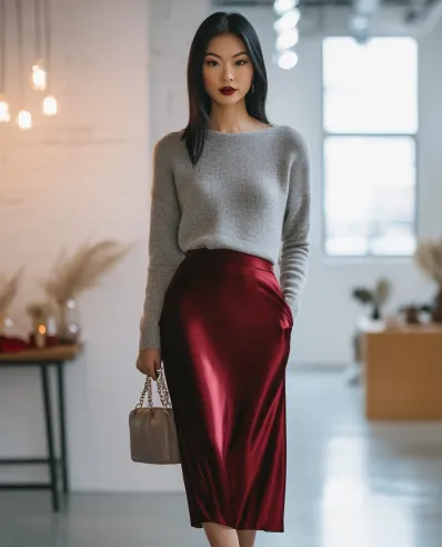 Cozy Meets Glam: Grey Sweater with Burgundy Satin Skirt