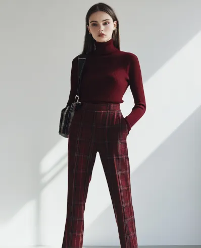This outfit is the perfect blend of preppy and polished. The rich burgundy turtleneck keeps things sleek and sophisticated, while the high-waisted plaid trousers add a fun, classic pattern that s totally timeless. With matching burgundy ankle boots and a structured bag, the outfit is both coordinated and effortlessly stylish. The high-waisted fit and tailored trousers create a long, lean silhouette, making this a go-to look for work or a stylish day out.