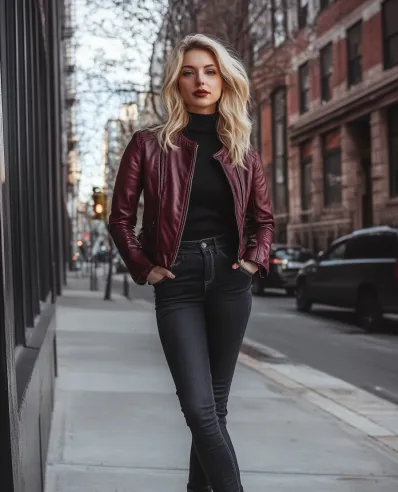 This outfit screams confidence and city chic! The burgundy leather jacket adds a bold, edgy twist to the classic black turtleneck and high-waisted black skinny jeans. The structured leather elevates the look, giving it that biker vibe without being too over-the-top. Burgundy ankle boots tie everything together perfectly, creating a sleek silhouette that s ideal for strutting through the city. Whether you re heading out for a casual lunch or just want to feel like a total boss, this look has you covered.